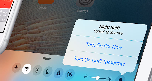 وقد أطلقت آبل على هذه الميزة اسم Night Shift حيث يقوم النظام بتخفيف الضوء الأزرق تدريجيًا وفقًا لمواعيد غروب الشمس بحسب المكان الجغرافي للمُستخدم.